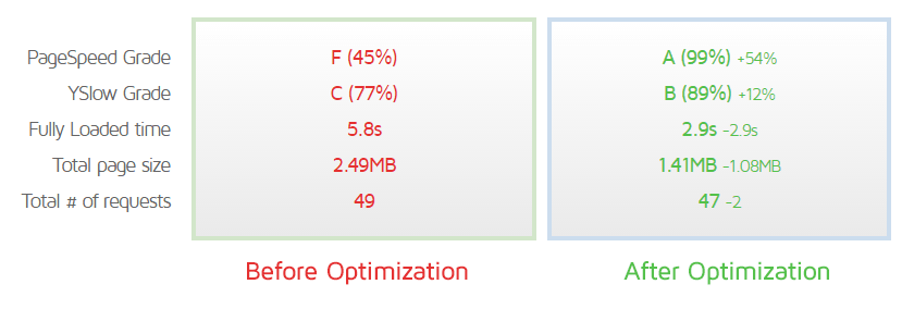 پس از مرور و آزمایشِ افزونه های متفاوتِ زیادی که در زمینه بهینه سازی وردپرس ارائه شده اند، ما به این نتیجه رسیدیم که ترکیبِ افزونه های WP Fastest Cache، WP Smush و راهکار تغییر تصویر به اندازه مورد نیاز، تأثیر بسیار مثبتی در اکثر وب سایتها داشته و منجر به افزایش کیفیت و سرعت وب سایتهای وردپرسی می شود. در تصویر انتهایی میتوانید تفاوت نتیجه را بر روی یک سایتِ تست شده مشاهده کنید