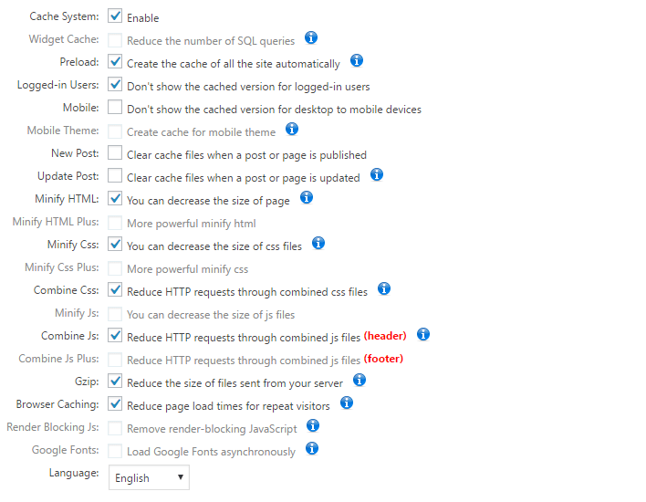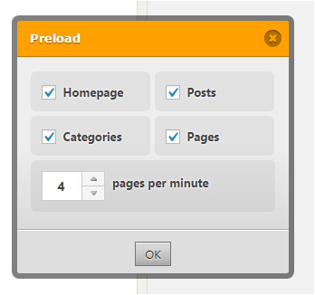 Preload : در هنگام فعالسازیِ این گزینه، از شما سؤالی مبنی بر انتخاب صفحات پرسیده می شود. تمام گزینه ها را فعال کرده و گزینه ی Pages per minute را روی 4 قرار دهید. در صورت عدم هماهنگی با سرویس دهنده میزبانیِ وبِ خود، شما باید این عدد را کم کنید.