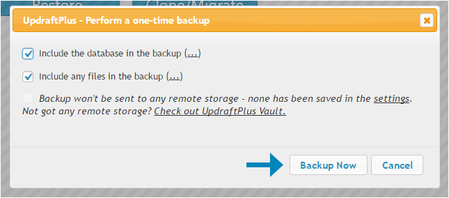 روی Backup Now کلیک کنید. یک صفحه پاپ آپ برای شما نمایان خواهد شد که تاییدیه دستورِ بکاپِ شما برای پشتیبان گیری از دیتابیس وب سایتِ شماست. همینطور این بخش از شما میپرسد که آیا تمام فایلهای وب سایت را بکاپ گیری کند یا خیر. توضیه میشود که هر دو گزینه را تأیید کنید تا نسخه پشتیبان کاملی از سایت وردپرس خود داشته باشید.